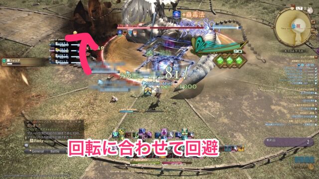 矢印の向きにボスが回転しながら、ボスの前後に範囲攻撃が行われます。
