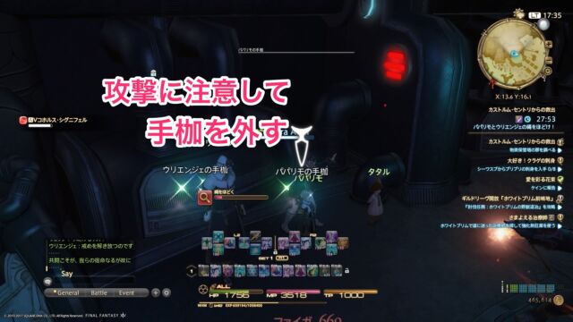 中にはパパリモ、ウリエンジェ、タタルが捕まっており、3人が手枷をした状態でバトル開始となります。