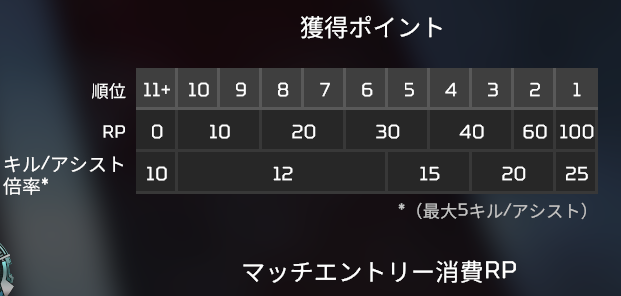 順位に応じたRPと、キル/アシストによるRPは以下の通り。