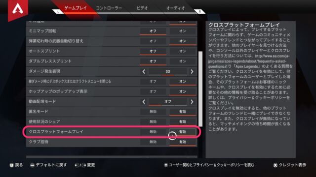設定の“ゲームプレイ”タブにある、「クロスプラットフォームプレイ」を有効にすると、クロスプレイ(PC、PS4のプレイヤーとマッチング)が可能となります。