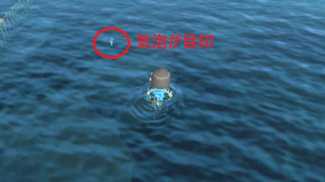 気泡を見つけたらある程度まで接近し、潜ります(遠すぎると途中で息切れして浮上してしまうので注意)。