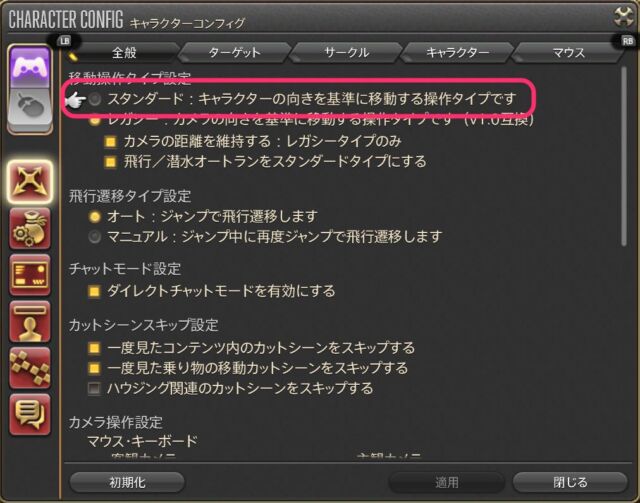 このマクロを使う場合、キャラクターコンフィグの「操作設定」→全般タブにある“移動操作タイプ設定”を『スタンダード』に変更しておきましょう。