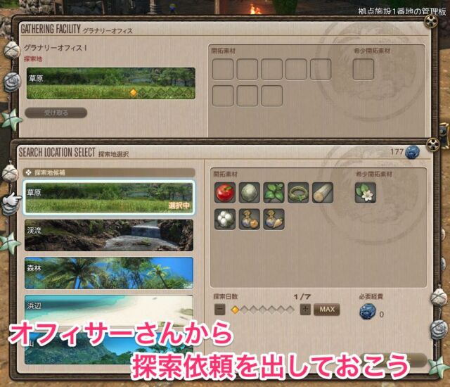 委託機能が解放されればお世話の手間は減りますが、素材採集のためにも1度は見に行きましょう。