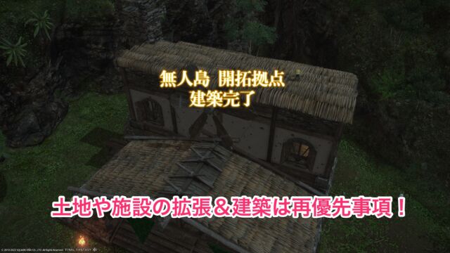 ランクアップに必要な経験値は、施設建築や拡張といった節目の作業を完了させると大きく稼ぐことができます。