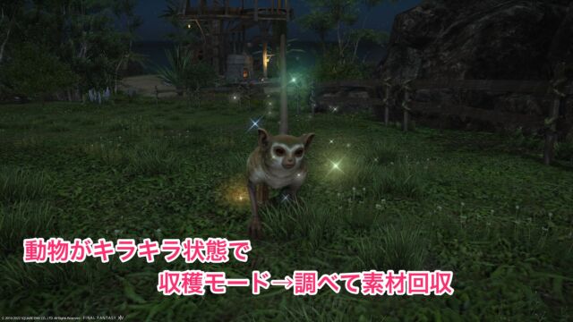 牧場では動物がキラキラしている状態で、収穫モードにして調べれば素材を採集できます。