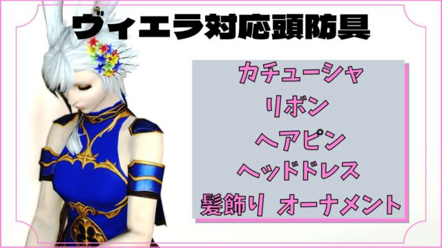 FF14内における、ヴィエラ表示対応の「カチューシャ」「リボン」「ヘアピン」「ヘッドドレス」「髪飾り(オーナメント)」系の頭装備をまとめています。ミラプリやSS用コーデの装備を探している方は、参考になれば幸いです。