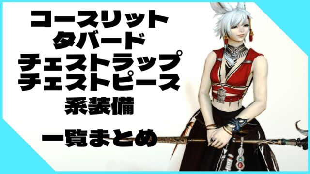 FF14内における「コースリット」「タバード」「チェストラップ、チェストピース」系の装備をまとめています。ミラプリやSS用コーデの装備を探している方は、参考になれば幸いです。