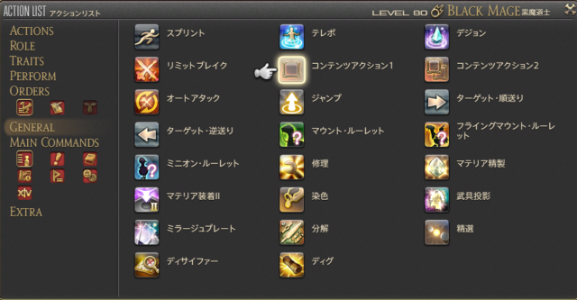 メニューを開いて、アクションリスト → GENERAL の中にあるので、ホットバーにセットしておきましょう。