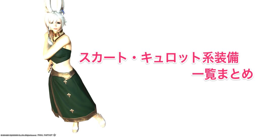FF14内における「スカート」「キルト」「キュロット」系の装備をまとめています。タイトやショートなどおしゃれなボトムスを掲載中です。ミラプリやSS用コーデの装備を探している方は、参考になれば幸いです。