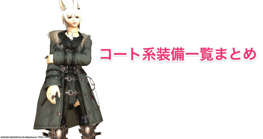 FF14内における「コート」系の装備をまとめています。ショートコートからロングコートまで、〇〇コートのおしゃれ装備を掲載中です。かわいいミラプリやかっこいいSS用コーデの装備を探している方は、参考になれば幸いです。