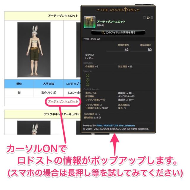- 基本情報の下に、ロドストへのリンクを載せています。カーソルONでポップアップを表示させられます。