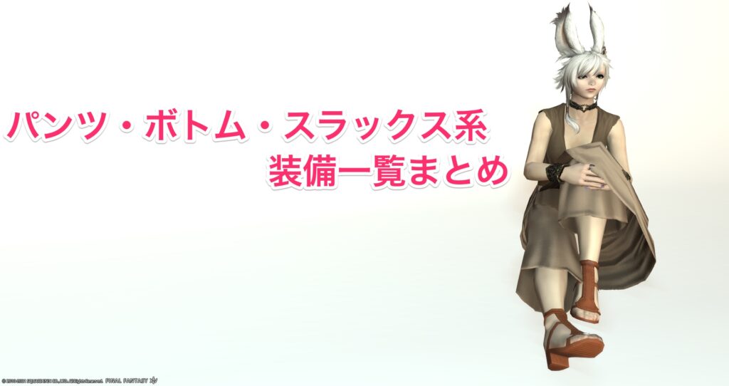 FF14内における「パンツ」「ボトム」「スラックス」系のズボン装備をまとめています。半ズボンからショートパンツ、短パンなどさまざまなボトムス装備を掲載中です。