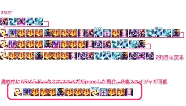 上述したようにベースは7連にしておき、魔紋中のAFパラドックスでファイガがprocしたら8連に、ただしprocサンダガ消失に注意する。