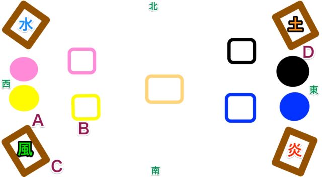 左上が水=ピンク、左下が風=黄、右上が土=黒、右下が炎=青です。
