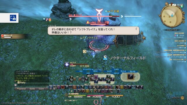 ガルーダが広範囲攻撃を詠唱し始めたら、ガルーダから対角の位置にある石にターゲットしてシフト。