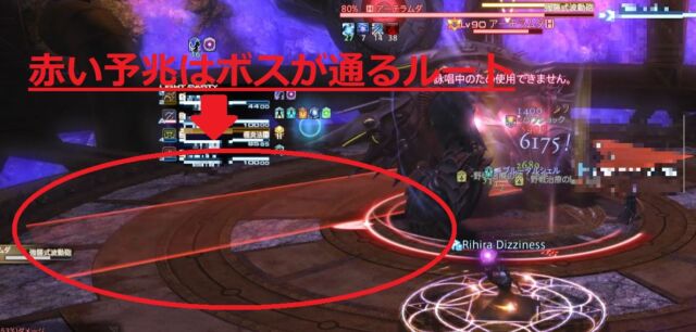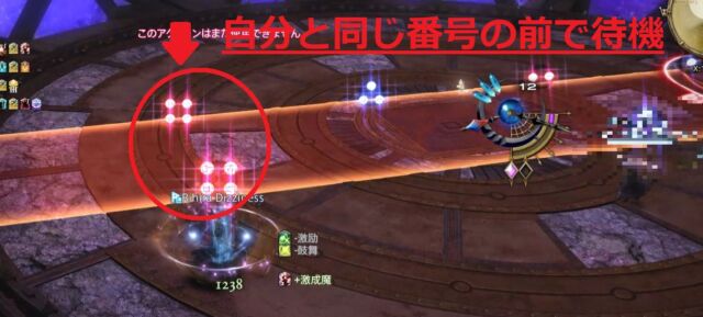 ・ 狙撃式波動砲 範囲予兆が出現し、範囲の上とPT全員に賽の目で番号が振られる。自分と同じ番号の前に立ち、攻撃を誘導する