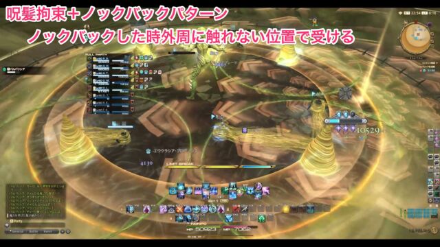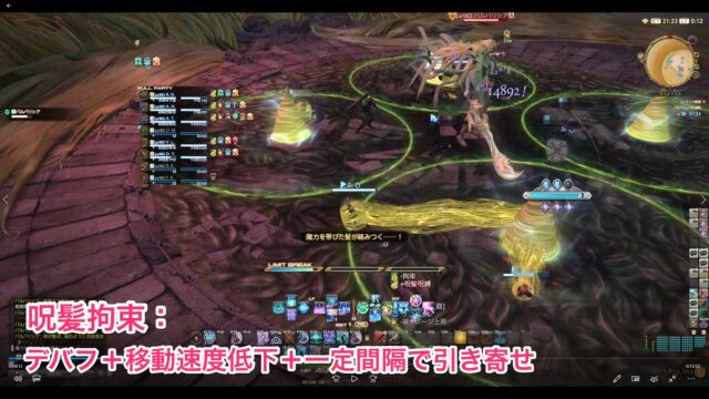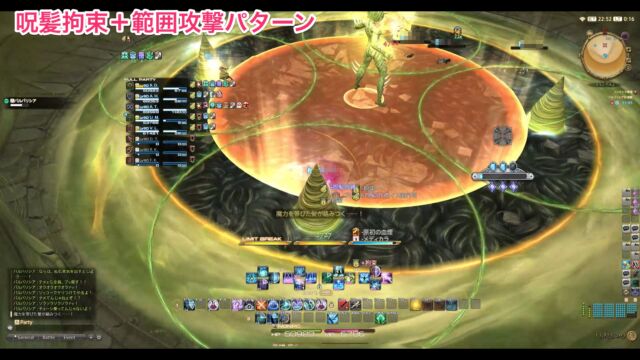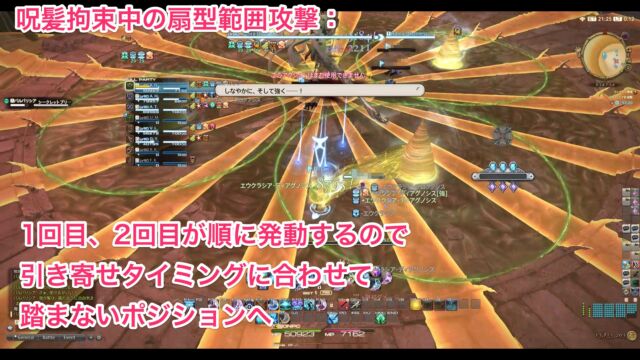 ボスから複数扇型範囲攻撃が2回に分けて発動。拘束されている時にくるため注意。引き寄せ時に範囲を踏まないよう立ち回る。