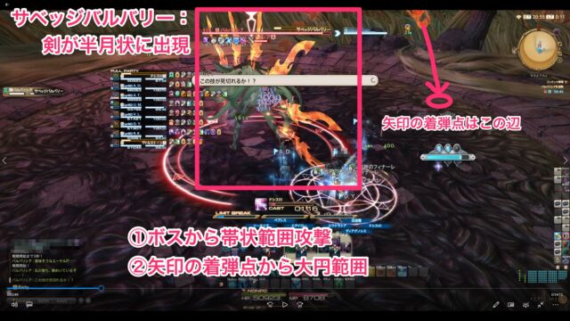 ◆剣がボス周りへ半月上に出現…ボス中心に帯状範囲→矢印の地点を中心に大円範囲