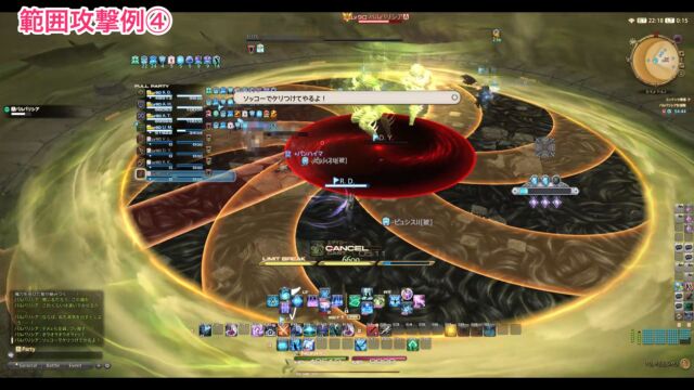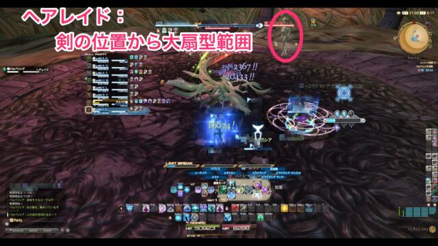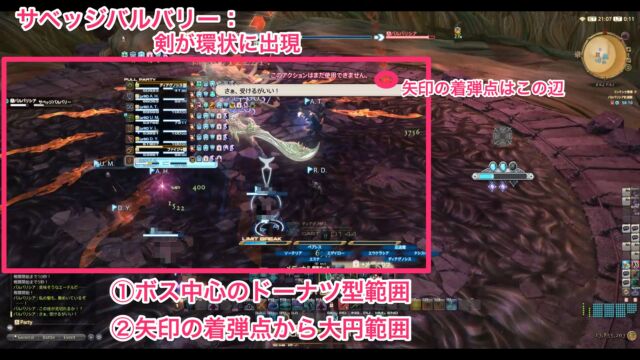 ◆剣がボス周りへ環状に出現…ボス中心のドーナツ型範囲→矢印の地点を中心に大円範囲