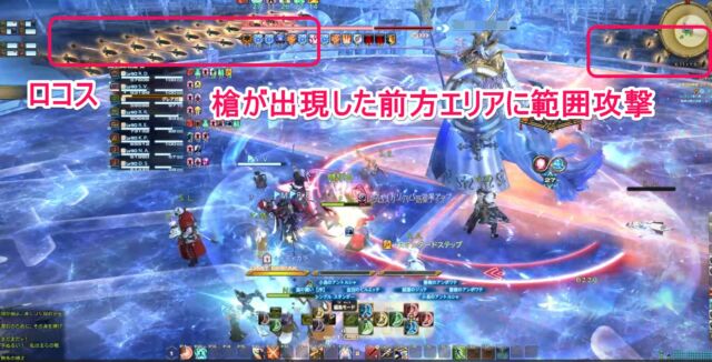 ロコス エリア端2箇所に槍がポップし、前方へ帯状の範囲攻撃。槍のないエリアに退避