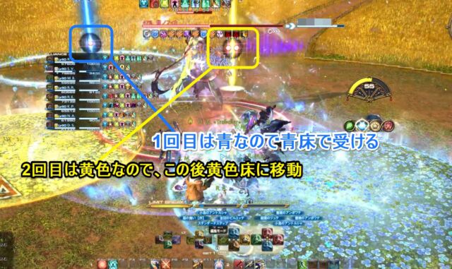 豊穣の息吹 青い床と黄色い床がポップする。同時に、番号がふられた青い光と黄色い光が降ってくる。番号順に全体攻撃が発動するが、同じ色の床を踏んでおけばダメージを受けない。番号順に同色の床を踏んで回避する。後半は回数が増える