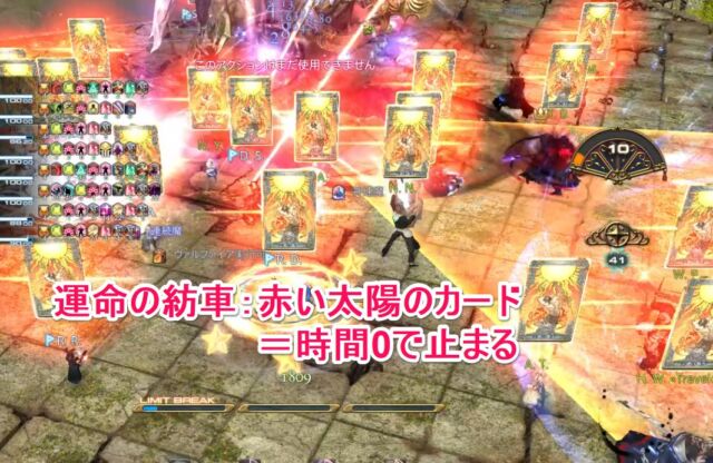 ・赤い太陽のカード 熱火の運命が付与される。デバフ時間が0になった時に行動しているとダメージ。0の時は止まっておく