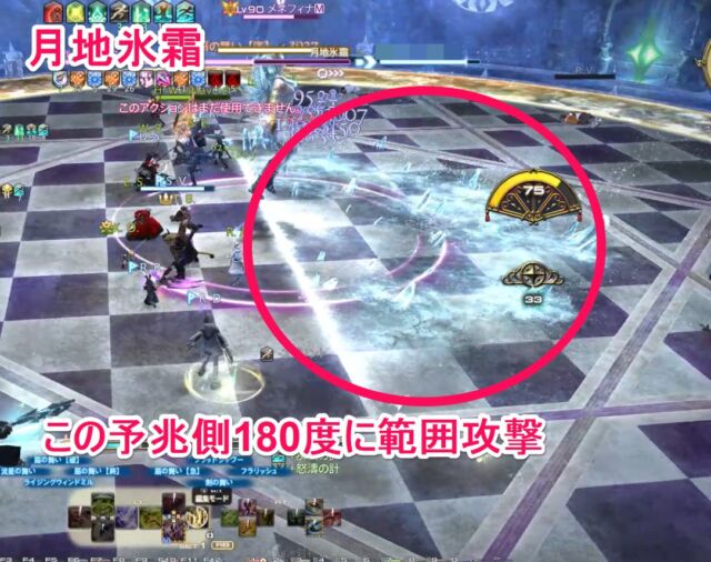 月地氷霜 ボスから僅かに氷の床範囲の予兆が出現し、そちら側のエリア180度に範囲攻撃。予兆を見逃さないように