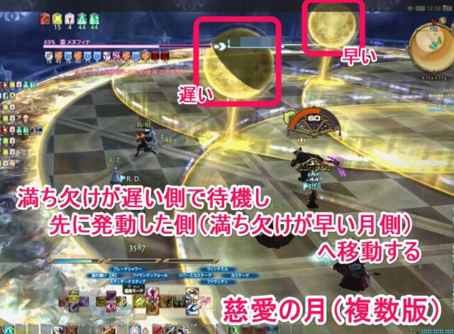 慈愛の月(複数版)+月夜の巡り 4つの小さな月がエリア上にポップし、それぞれを中心に円型範囲(発動は月が満ちた時)。満ち欠けの速度が速い月と遅い月が2組ずつある。満ち欠けが遅い月の近くで1組目の発動を踏まないよう待ち、発動したら2組目が発動しないうちに安地に退避する