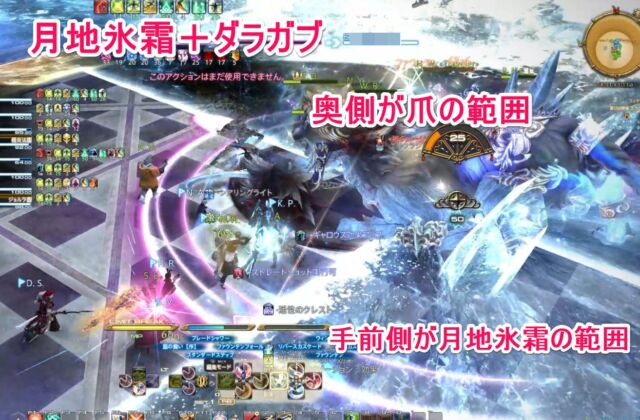 月地氷霜+ダラガブの爪(無詠唱) 「ダラガブが爪を振りかざした…!」の合図とともに、ダラガブの爪が光る。爪側方向のエリアに180度範囲攻撃+月地氷霜(ボスから氷の範囲180度)。どちらも踏まない位置で回避