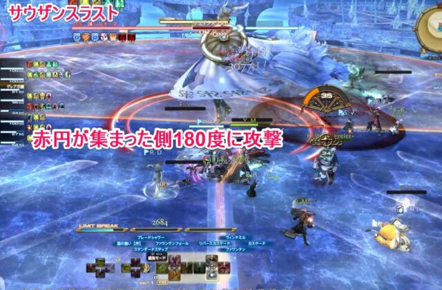 サウザンスラスト ボス周囲に赤い円がポップ。最終的に円が集まった方向のエリア180度に範囲攻撃