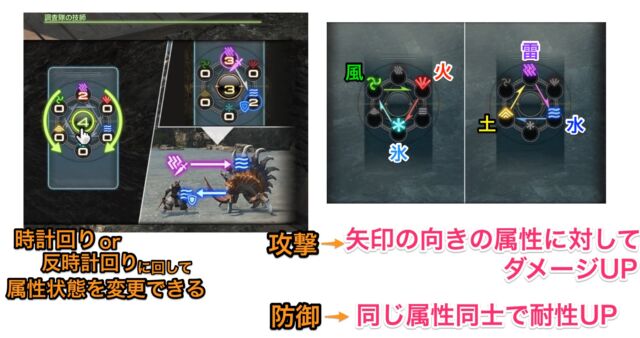 魔唱石をセットした属性は強化されるので、これを利用して敵の弱点属性をついたり、特定の属性攻撃の耐性を高めることが可能に。