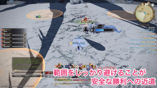 ボスが飛んで攻撃不可能になると、氷柱からの直線範囲攻撃(複数)とカータライズ(フィールド半分攻撃)が続きます。