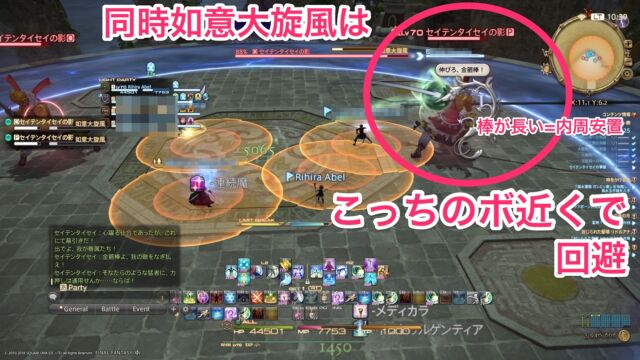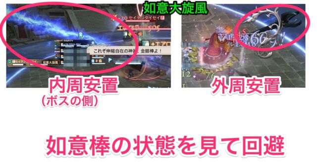 如意大旋風…内周か外周範囲攻撃。如意棒が帯電しているなら内周が安置、短いままなら外周が安置。短い場合は発動直前にボス周囲に範囲がポップするが、出現時間が短い ※下画像参照