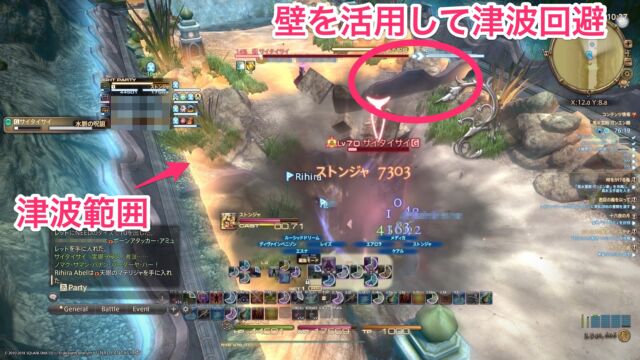 ここでは一定間隔で津波が発生し(範囲は表示される)、くらうとノックバックされます。