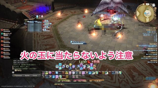 天狗火…周囲に無数の火の玉出現、触れると熱傷デバフ。火の玉は動くので注意。