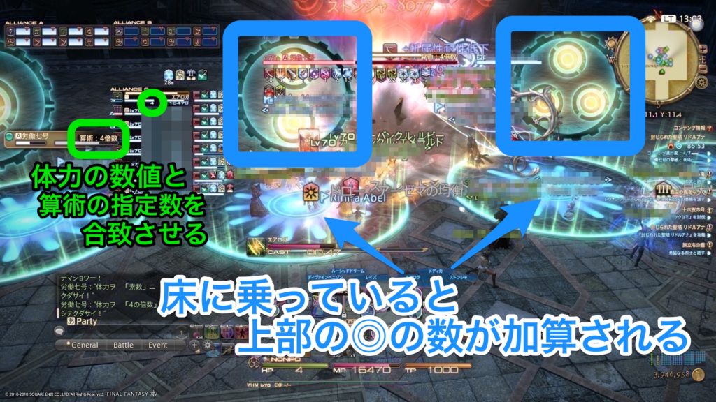 ボスの位置を確認&ボスの直線上から退避し、床を踏まないようフィールド外周へ移動。移動中に範囲マーカーがついた人は他メンバーに重ねないよう注意。ボスが直線攻撃を行ったら中央からの距離減衰攻撃(落着する?)なので、そのままフィールド隅に行き受ける