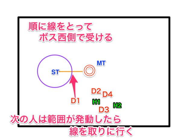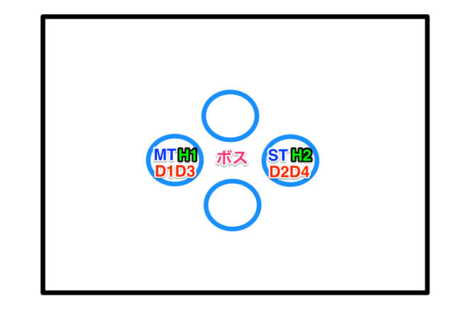 ブランブルチェーン…タンクヒラとDPSが線で繋がれる。THは北側、Dは南側に離れて切る(画像参照)