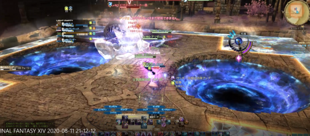 ネクロマンシー(通常の線) 4つの黒い床からネクロボムが出現し、メンバーと線で繋がれる。繋がったメンバーを追いかけ、一定時間後倒れる。なるべく同じ場所に集めておく。