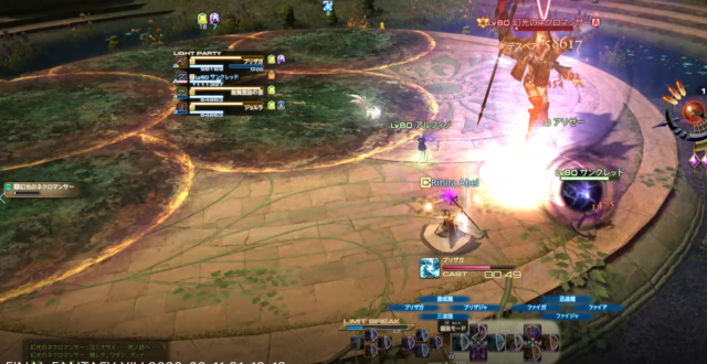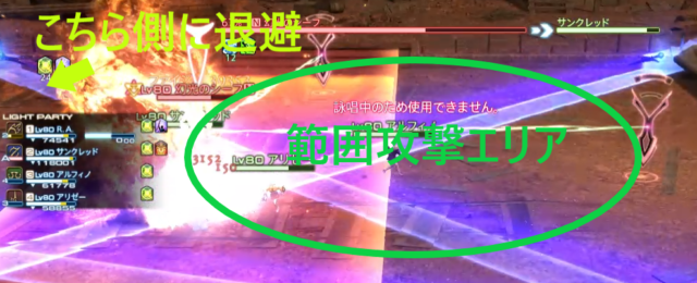 分身ダッシュ ボスと2つ矢印が線で繋がれ、カウント後に矢印の地点に瞬間移動+範囲攻撃。帯状範囲と、円範囲の2パターンがある。カウント中の予兆を見て形を判断し、瞬間移動後の範囲に当たらない位置に退避。帯状の場合は矢印があるエリアの3分の2が範囲となるので、ない側に退避すればOK。