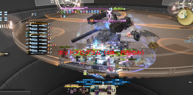 攻撃:収束粒子砲 … 一瞬出る丸いマーカーに向かって、ボスから大扇型範囲攻撃。範囲同士の隙間(黄色と黄色が重なって濃くなっている部分)に退避しておくと、安地ができる。ただし、重なる速さが遅い部分(太い部分)は安地ができないため、収縮が早い部分(細い部分)で待機する