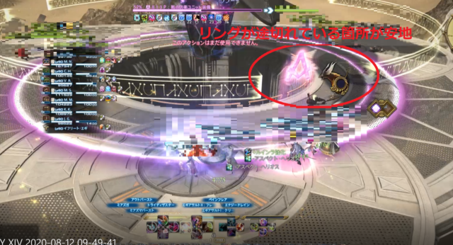 終焉ノ歌(詠唱なし) … ボスからリングが出現し、エリア端まで到達するとボスから扇型範囲攻撃。リングが欠けている部分が安地。連続でくるため、次の安地を確認しながら戦う