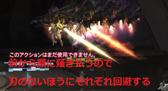 連携:突進斬撃 … エリアの片側に大円範囲範囲が敷かれる。予兆が出たら安地側に退避(遠いアライアンスは中央よりで戦っておくと退避しやすい)。さらにボスから突進斬撃があるため、安地側にいるボスの刃がどちら側に出ているか確認する。前にいるボスから順に斬撃が飛ぶので、それぞれ刃のない方で回避。後半はランダムマーキング(対象者に円範囲)と一緒にくるので、重ねない