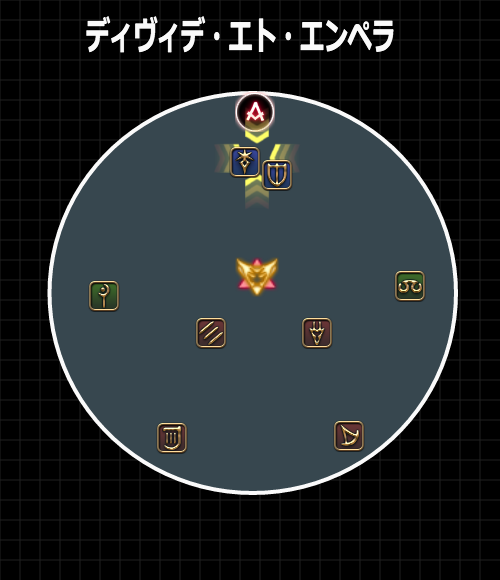 ディヴィデ・エト・インペラ…タンクに赤い頭割りマーカーと、他メンバーに小範囲攻撃。タンクは重なり、他メンバーは散会して受ける。(タンクは1回目は無敵受けでもOK。要相談)