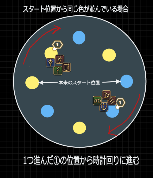 スタート時、9時10時、あるいは3時4時の位置に同じ色が並んでいる場合は、1つ進んだ場所(10時または4時)の位置から玉を取り始めましょう(画像参照)。