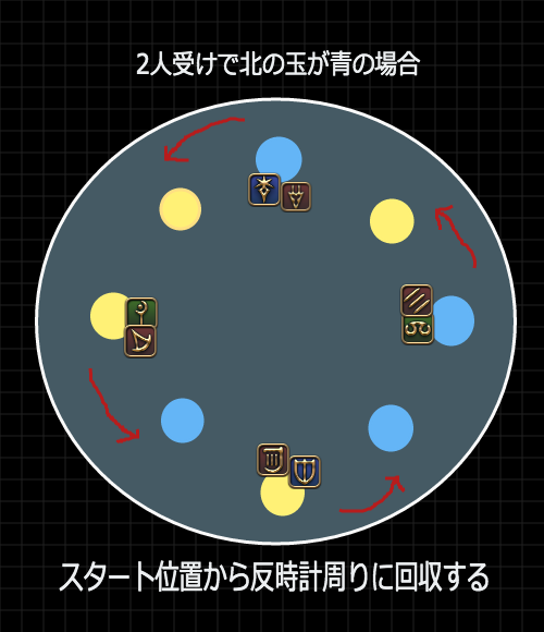 北の玉が黄色なら時計回り、青なら反時計に回収していきましょう(画像は北が青玉の場合)。