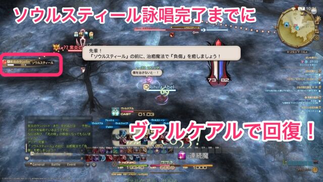 攻撃をくらうまでにヴァルケアルでHPを回復させてデバフを解除しましょう。