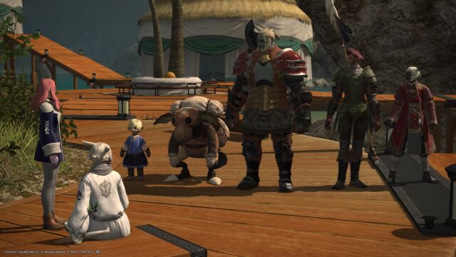メインクエスト「晩餐に添える華」にて、飾り付けや配膳の手伝いをする冒険者。