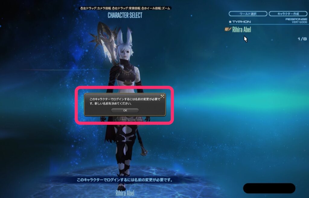あとはFF14にログインし、キャラクター選択画面で対象キャラクターを選べば、名前変更ができますよ。