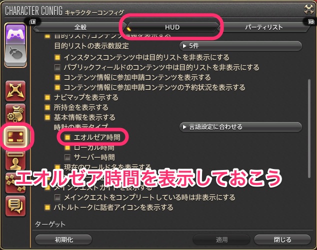 一覧の中に「時計の表示タイプ」があるので、この“エオルゼア時間”をONにしておきましょう(最後に適用を押して反映)。