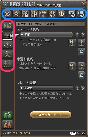 2層の四角アイコンは「エフェクト/フレーム表現設定」。